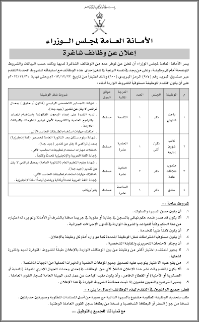 وظائف الأمانة العامة لمجلس الوزارء العماني 2014